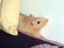 Won-Ton came into my home when she was baby with her sister Sushi. Won-Ton was more timid then her sister, and loved to sit on your shoulder and give kisses to your nose. She did however always defended her turf, while she and Sushi where kept in the smaller cage as babies, my cat Hitomi thought she would give them a sniff, Won-Ton bit her and Hitomi screamed bloody-murder, the cat no longer bothers the rats since then.